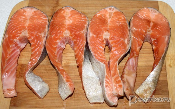 Рыбные стейки (купленные в супермаркете или нарезанные самостоятельно) смазываем соевым соусом. Натираем измельченным в прессе чесноком, с обеих сторон посыпаем солью и смесью перцев из мельнички.