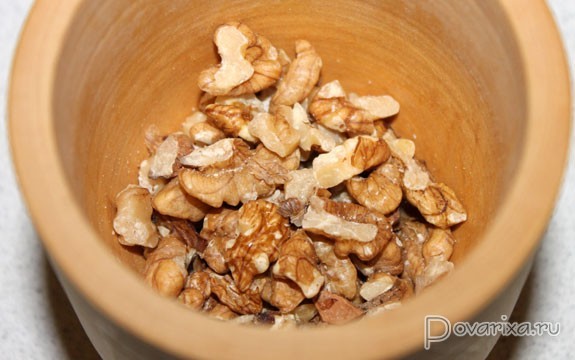 Орехи грецкие и миндаль толчем в ступке, но не до порошка, а до небольших крупинок.