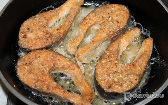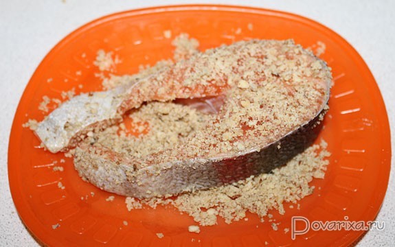 Обваливаем стейки в орехах, прижимая ладонями орехи к рыбе.