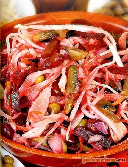 РусскаяКаноны канонами, а иной раз хочется как-то подновить привычный вкус. Так что попробуем сделать винегрет по-новому – без картошки, но с фасолью и шампиньонами.