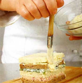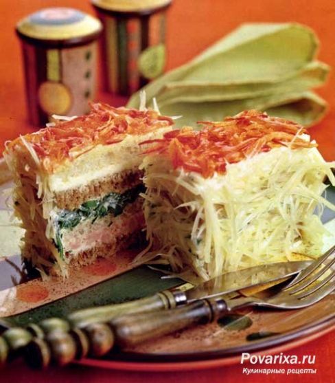 РусскаяБутербродные, или слоеные, несладкие торты - тот же клубный сэндвич, которым нас как-то угощали в другой стране. Российская привычка держать бутерброд в руке моментально рождает вопрос: разве можно так разинуть рот, чтобы откусить от этого сэндвича?