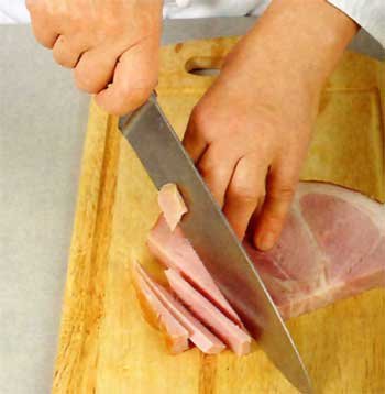 - Очень мелкими кубиками старательно нарезаем окорок.