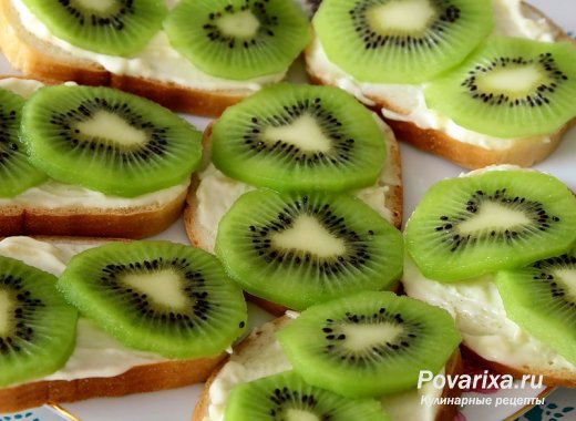 - С киви снимаем кожицу и нарезаем тонкими ломтиками, которые и кладем сверху на бутерброд. Можно еще и на киви капнуть майонез.