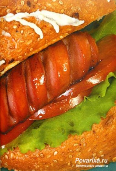 3. Булочки разрезаем пополам вдоль (если это не сделали в пекарне). На нижние половинки выкладываем листья салата, кружки помидоров, сосиски, прижимаем верхушки булочек. Выкладываем в соответствующую посуду и ставим в микроволновку на 30 секунд или в духовку при 150° - на 2-3 минуты. Готовые сэндвичи украшаем майонезом и подаем к ним любимый кетчуп.